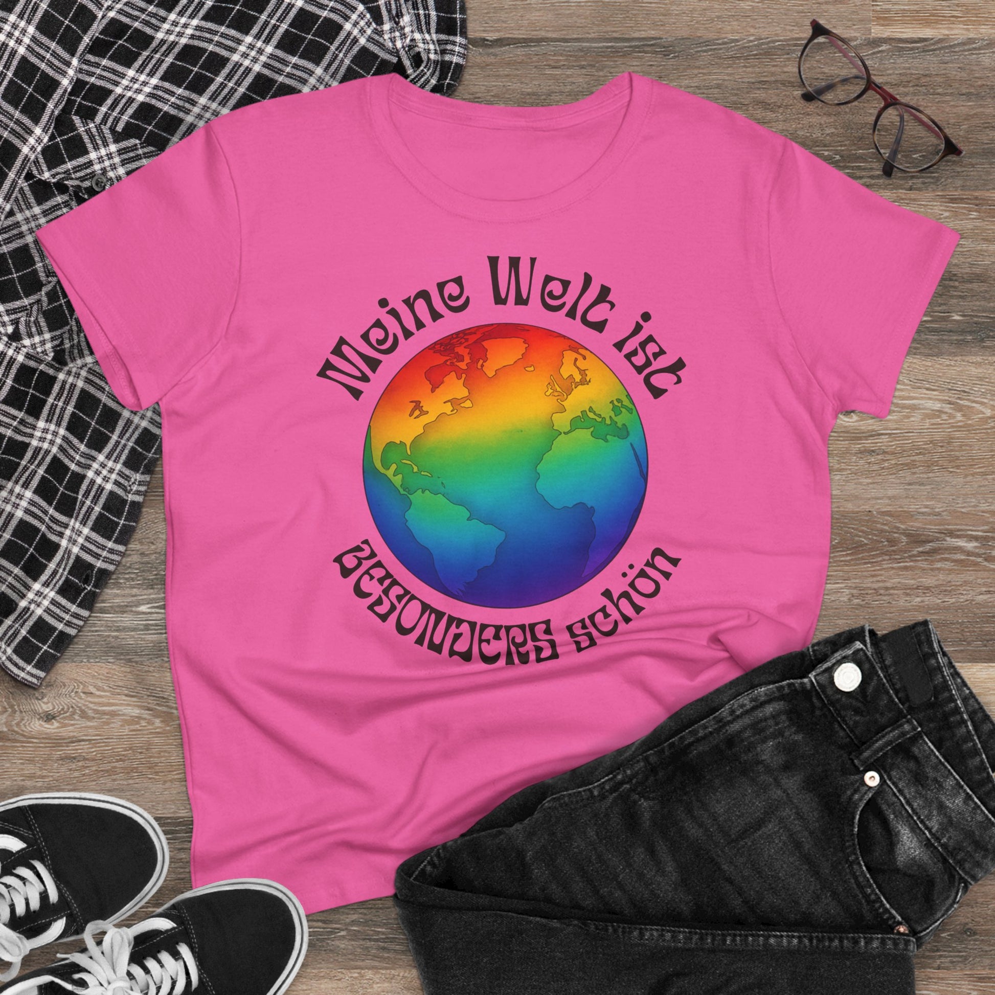 Mit dem Regenbogen-Globus und dem Schriftzug „Meine Welt ist besonders schön“ setzt du ein klares Zeichen für Akzeptanz, Vielfalt und Selbstliebe.