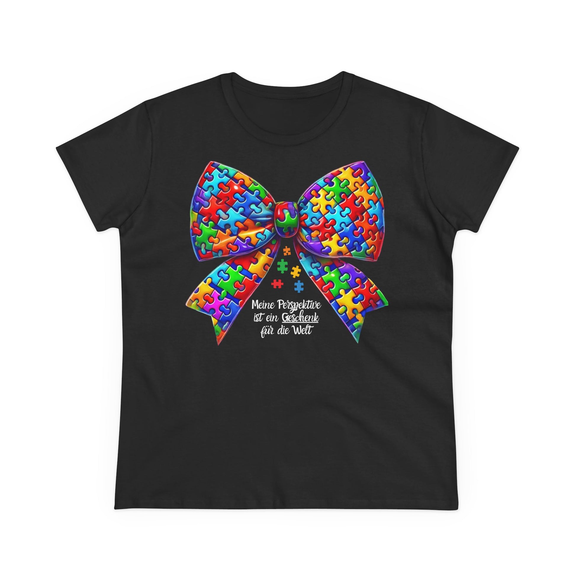 Die farbenfrohe Puzzle-Schleife symbolisiert Einzigartigkeit, Vielfalt und Akzeptanz. Mit dem Schriftzug âMeine Perspektive ist ein Geschenk fĂŒr die Weltâ trĂ€gst du nicht nur ein KleidungsstĂŒck, sondern eine Botschaft nach auĂen â fĂŒr mehr Sichtbarkeit, Selbstliebe und Inklusion.