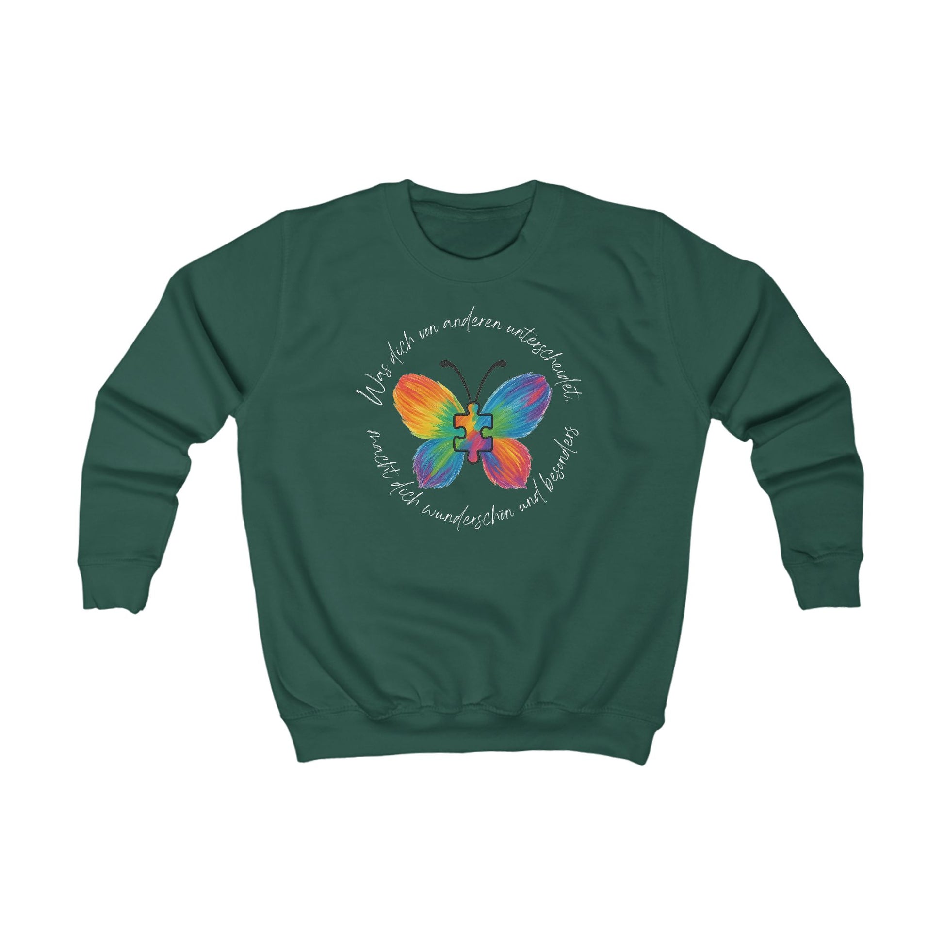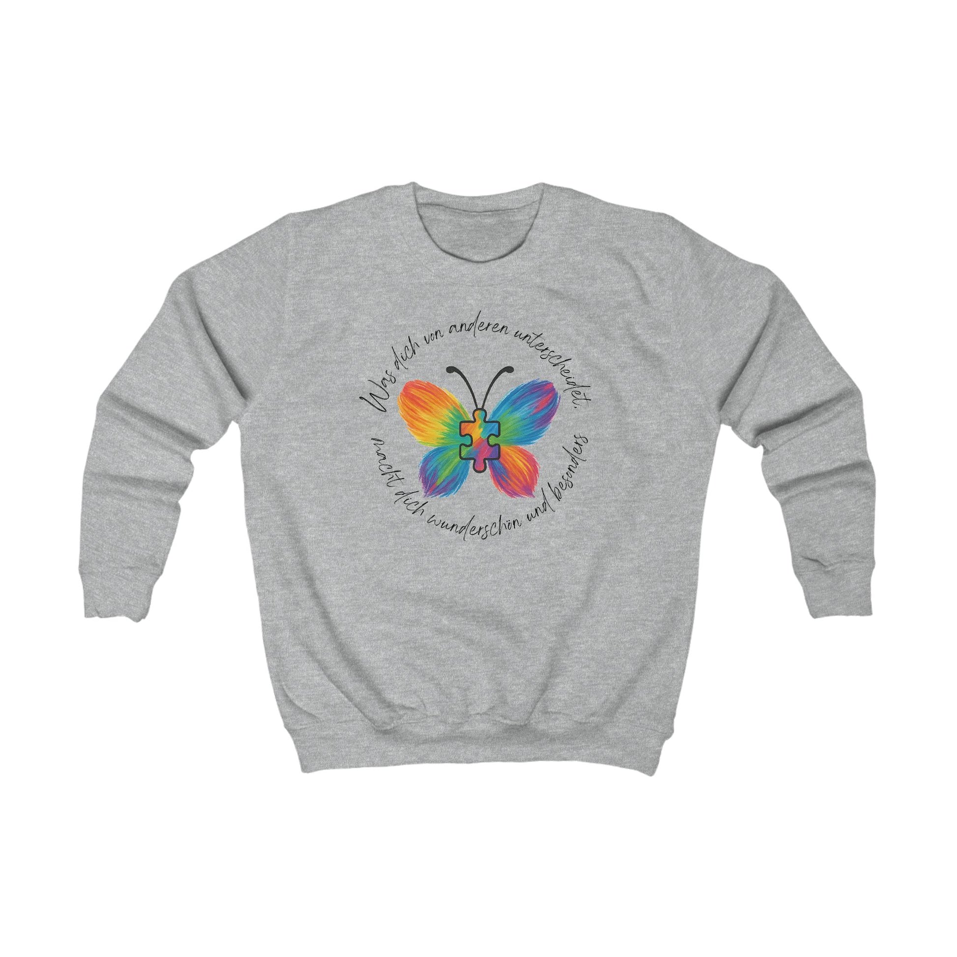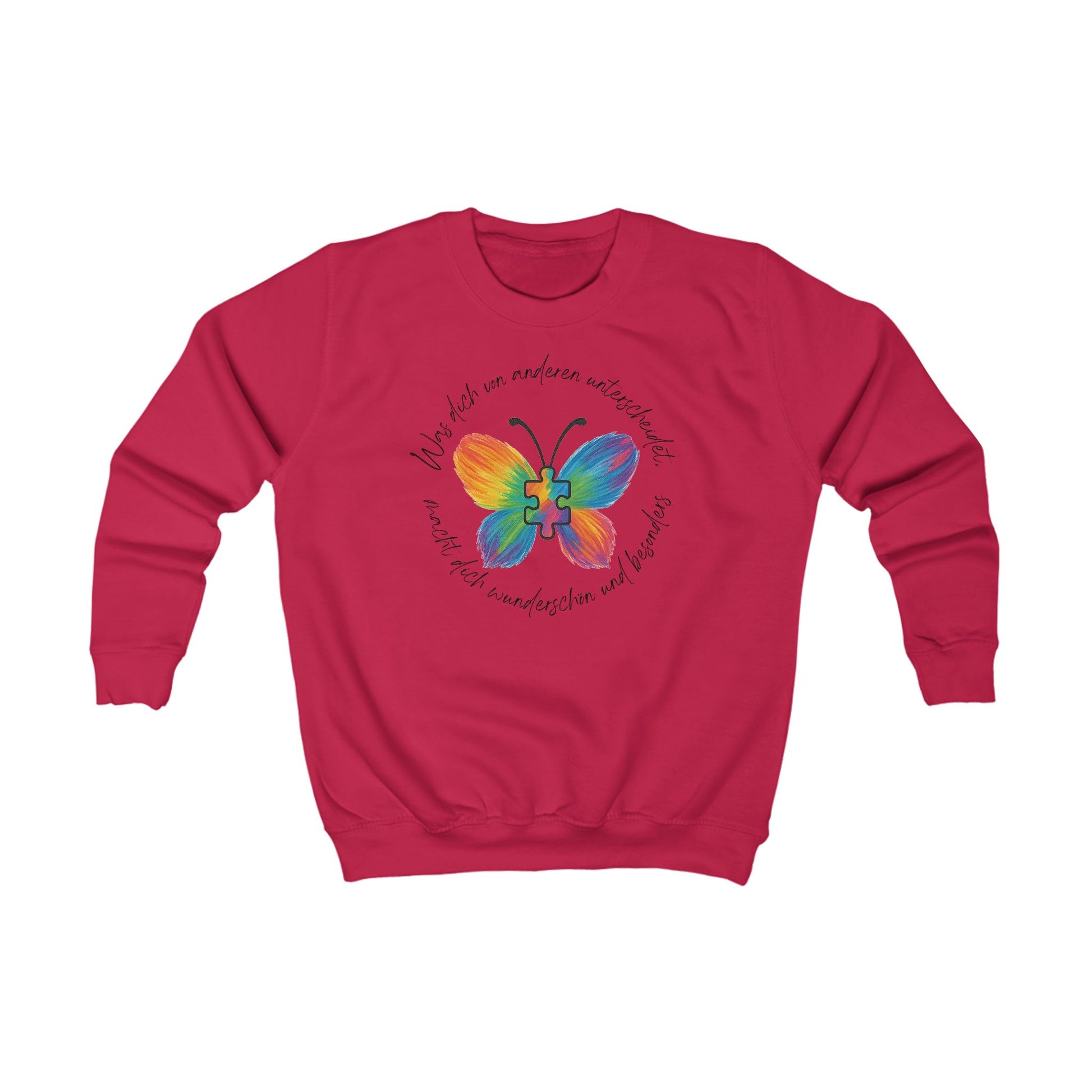 Dieses Sweatshirt mit dem farbenfrohen Regenbogen-Schmetterling und dem inspirierenden Spruch „Was dich von anderen unterscheidet, macht dich wunderschön und besonders“ erinnert Kinder daran, dass sie genau richtig sind – so wie sie sind. 💛🦋